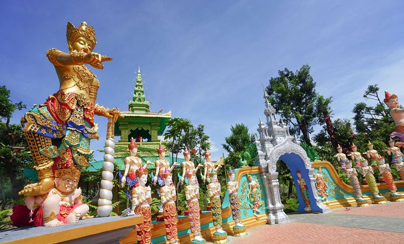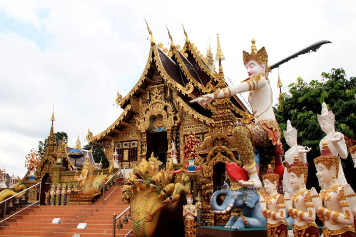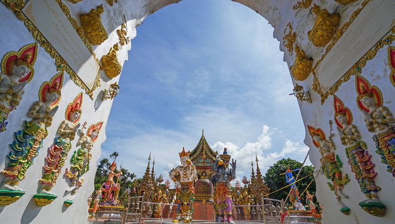 ซุ้มประตูของวัดที่มีความอลังการ ด้านหน้ามีรูปปั้นพระอุปคุต และพระสังกัจจายน์ ตั้งขนาบสองข้างซุ้มประตู รูปปั้นท่านท้าวจตุมหาราชทั้งสี่ ประกอบไปด้วย ท้าวเวสสุวรรณ ท้าวธตรฐ ท้าววิรูปักษ์ ท้าววิรุฬหก มองเห็นยักษ์สองตนด้านขวานั้นในมือมีทั้งบุหรี่และเหล้า ทำสัญลักษณ์มือบอกรัก ส่วนที่เท้ามีทั้งรองเท้าแตะและรองเท้าผ้าใบคอนเวิร์ส เรียกได้ว่าเป็นปริศนาธรรมที่ผสมผสานความเชื่อดั้งเดิมเข้ากับวัตถุสมัยนิยมในยุคนี้ ซึ่งยักษ์ทั้ง 2 ตนนี้ได้ถูกกล่าวขานถึงอย่างกว้างขวาง